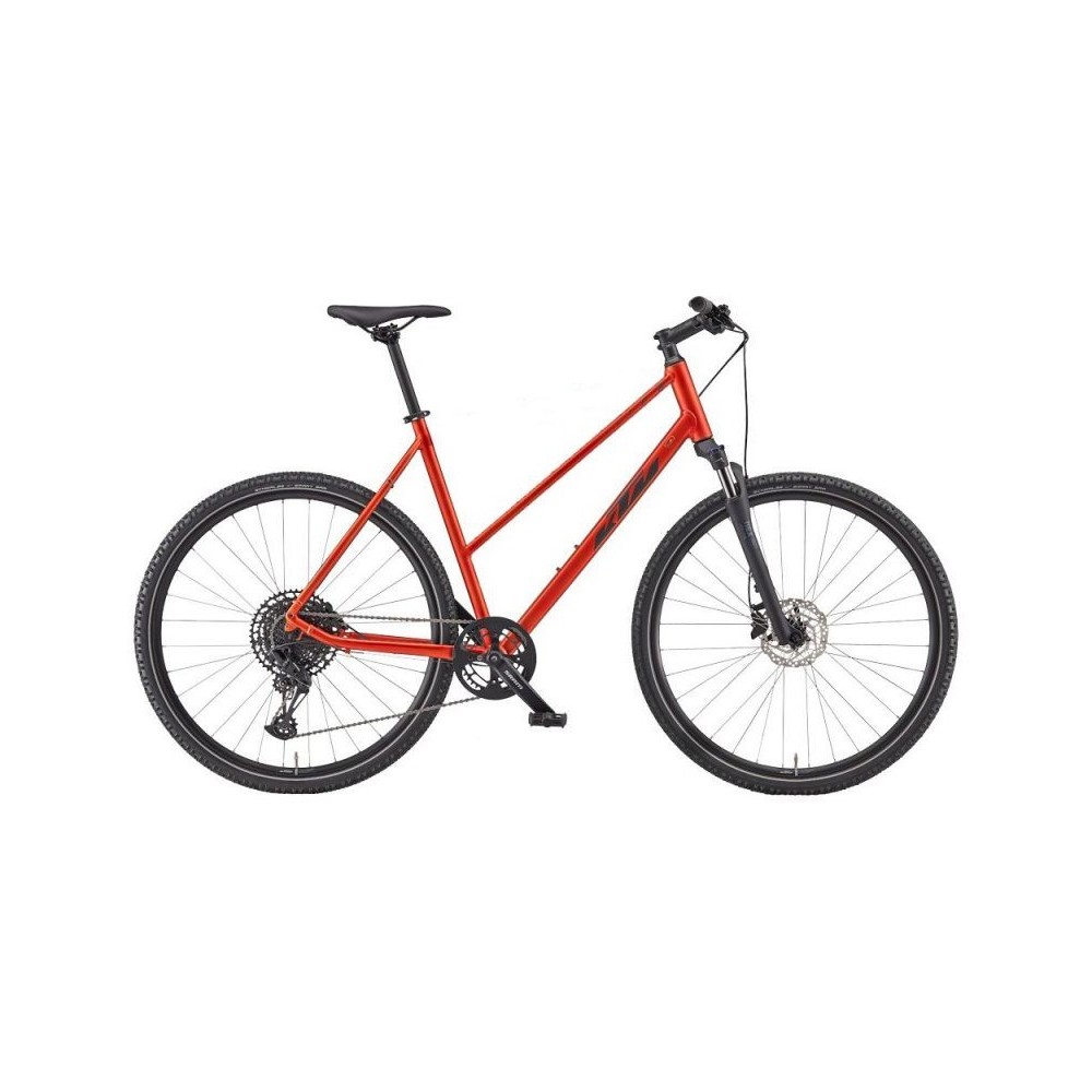 KTM X-LIFE CROSS es una bicicleta de trekking de alto rendimiento, diseñada específicamente para mujeres, ideal para disfrutar de la naturaleza y rutas deportivas. Con la vasta experiencia de KTM, este modelo ofrece una combinación de confianza y rendimiento superior. Su cuadro ligero de aluminio 6061 de 28 pulgadas proporciona durabilidad y una postura de conducción cómoda y eficiente, adaptada a la ergonomía femenina. La horquilla de suspensión Suntour NEX HLO DS de 63mm con bloqueo absorbe eficazmente las irregularidades del terreno, ofreciendo un gran confort y la posibilidad de bloquearla para una mayor eficiencia en asfalto liso o ascensos.